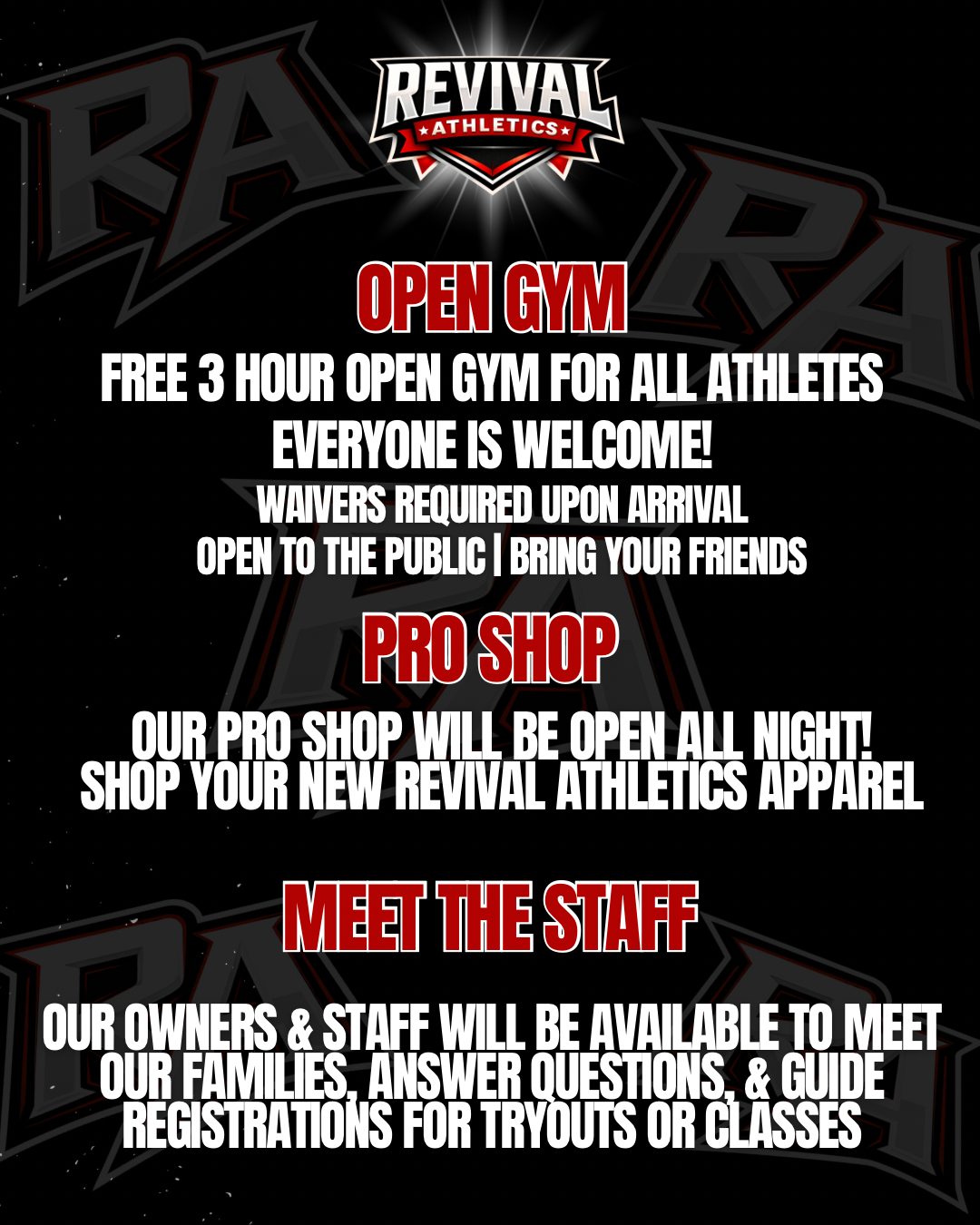 Whether you're new to cheer or looking for the right place to take your training to the next level, we invite you to step inside, feel the atmosphere, and see what makes Revival Athletics different. Bring your family, bring your friends, and come celebrate the beginning of something special.