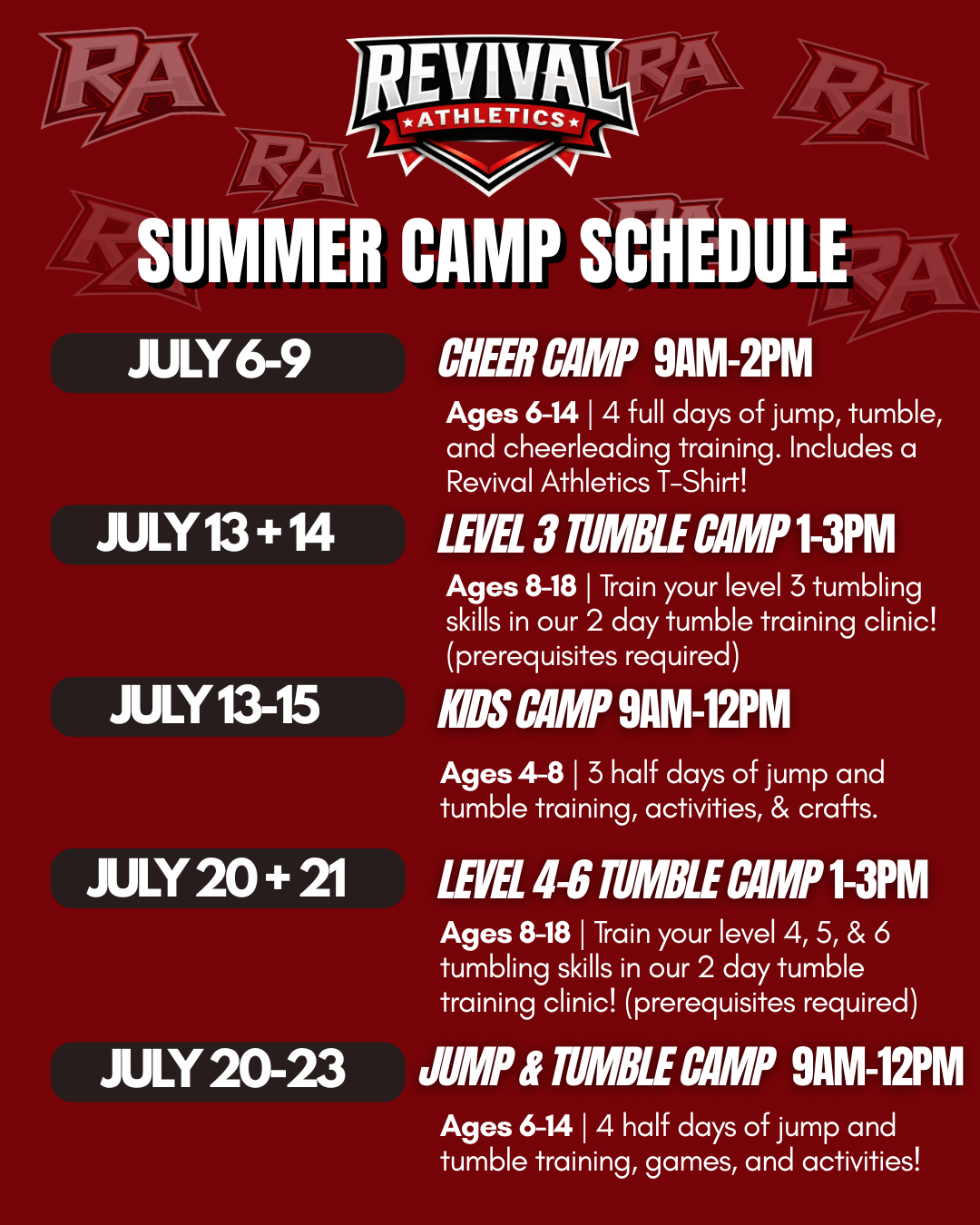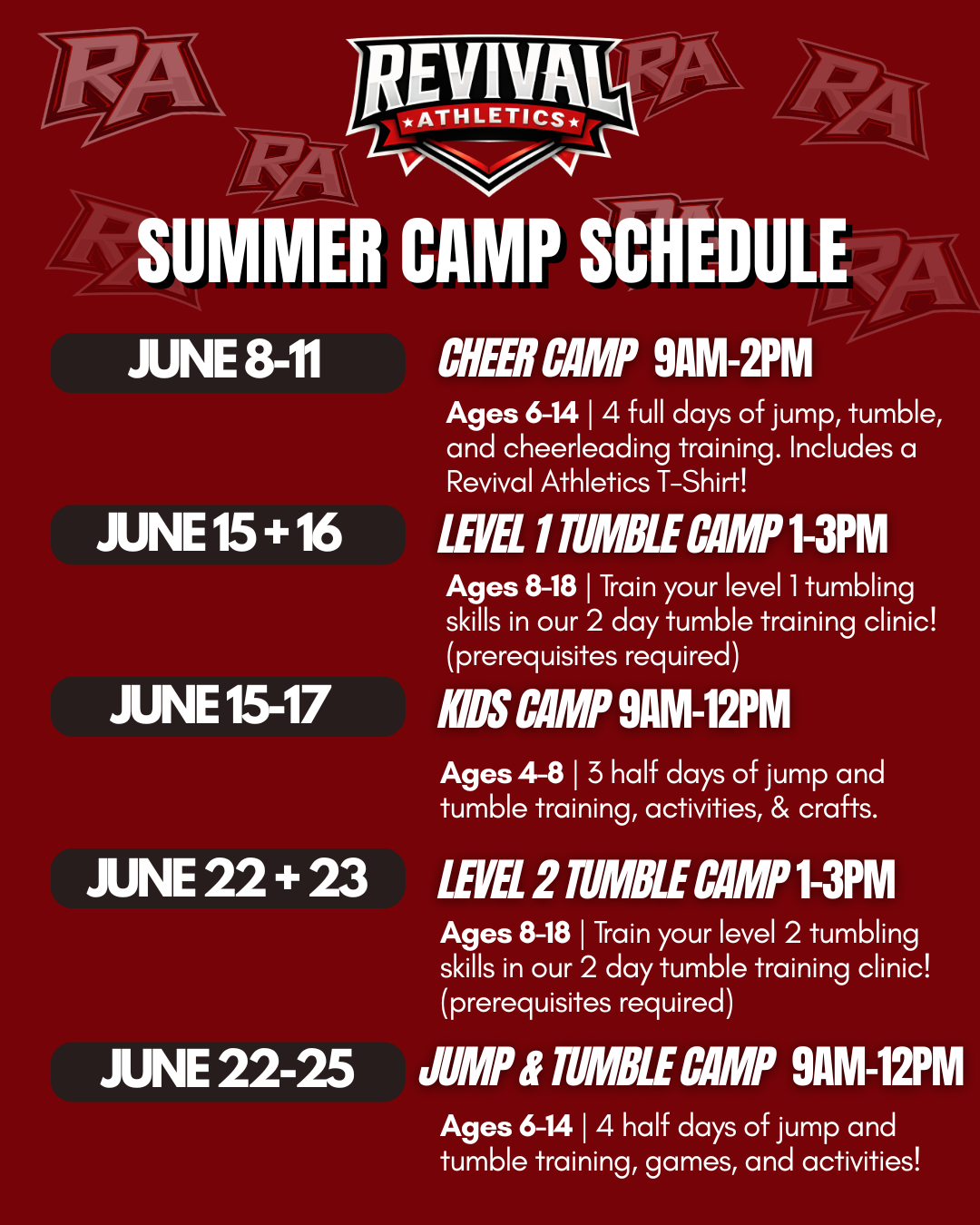 Get ready for a summer full of energy, confidence, and fun at Revival Athletics Summer Camps! Whether your athlete is brand new to cheer or working to level up their tumbling skills, our camps are designed to keep kids active, learning, and having a blast all summer long.